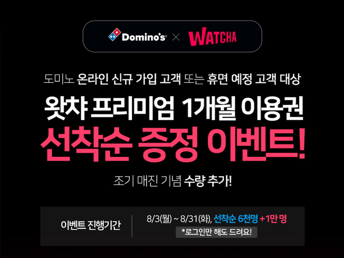 또한, 도미노피자 온라인 홈페이지 신규 가입 고객 또는 휴면 예정 고객을 대상으로 ‘왓챠 프리미엄 1개월 이용권’을 증정하는 이벤트가 고객들의 성원에 힘입어 조기 매진되면서 이용권 1만매를 추가 제공한다.