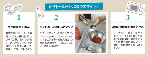 基本のピザトーストは食パンにトマトケチャップを塗り、スライスした玉ネギとマッシュルームを全体に散らす。シュレッドチーズ(ピザチーズ)で全体を覆い、薄切りにしたソーセージ、種をとって輪切りにしたピーマンをトッピング。180度のオーブンやオーブントースターで、チーズが溶けるまで8分ほど焼く。ケチャップに少量のチューブのおろしにんにくと白ワインビネガー、オレガノを加えて“トマトソース風”にするのがおすすめだ。