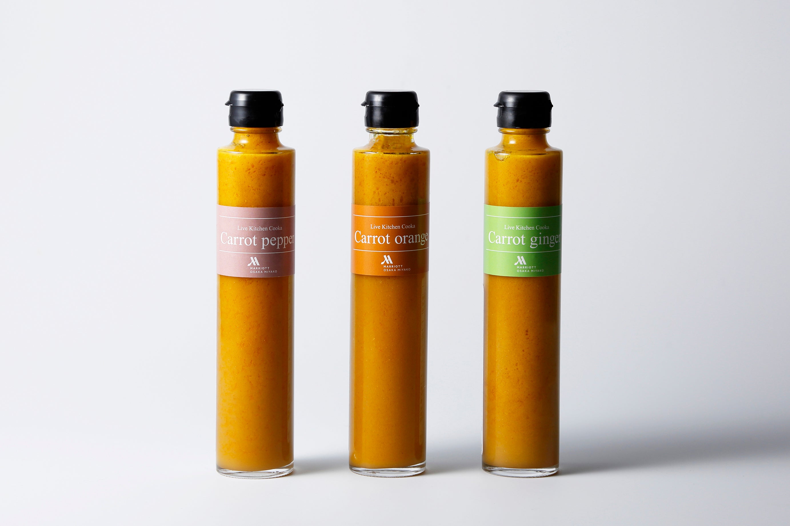 「COOKA」のサラダコーナーで人気の“人参ドレッシング”をベースに、ペッパー、オレンジ、ジンジャーの3種類のフレーバーを用意しました。ホテルの味をご家庭で楽しめるのはもちろんのこと、食卓を彩るラインナップです。また、贈答品や手土産にもおすすめです。