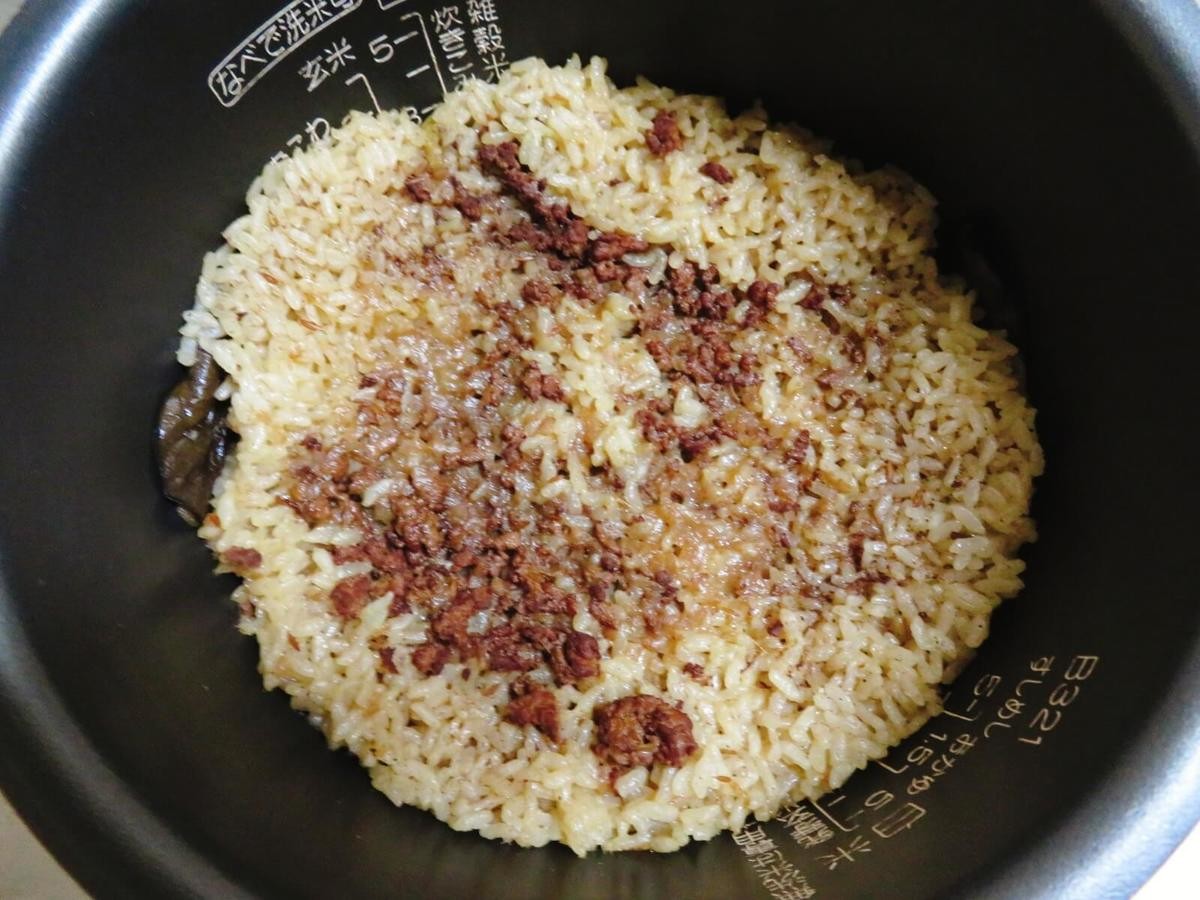 フライパンで焼いた上に炊飯したため、ナスがとろっとろ。スプーンで切れるくらい柔らかく、噛むたびにジュワーっと旨味が広がります。