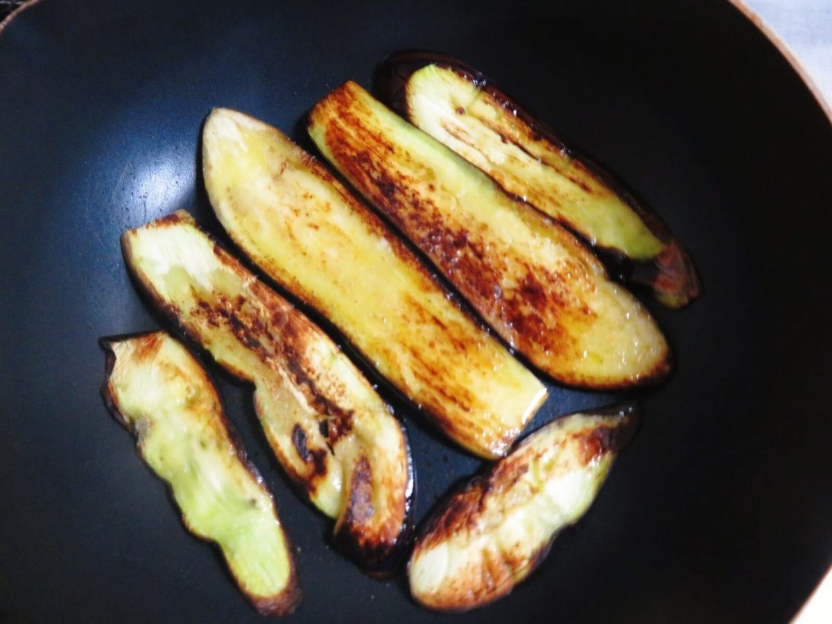 ナスは6mmくらいの厚さに切り、オリーブオイル(大さじ3)を入れたフライパンで、両面に焼き目がつくまで焼きます。